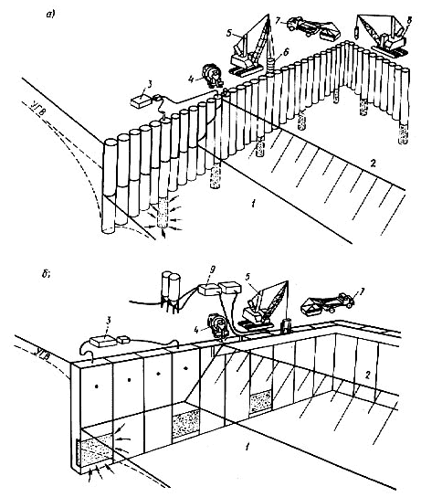 Для ограждения котлованов, траншей, подземных выработок и защиты проводимых в них строительных работ от поступления грунтовых вод в зависимости от физико-механических свойств грунта, его состояния, мощности водоносных слоев существуют следующие способы закрепления грунта: замораживание, инъецирование в грунт растворов-отвердителей, устройство тиксотропных противофильтрационных экранов и завес, устройство шпунтовых ограждений.
