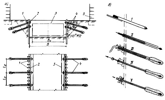 В последнее время для воспринятия опрокидывающих моментов, возникающих от действия грунта на шпунтовые, свайные и другие ограждения выемок, применяют анкерные устройства (грунтовые анкеры). Анкеры устраивают в одном или нескольких уровнях по высоте откоса под углом к горизонту до 25°.
