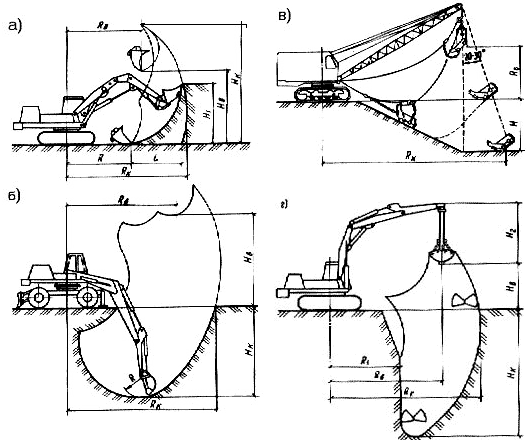 Рис.12. Схемы работы гидравлических экскаваторов с различными видами рабочего оборудовании