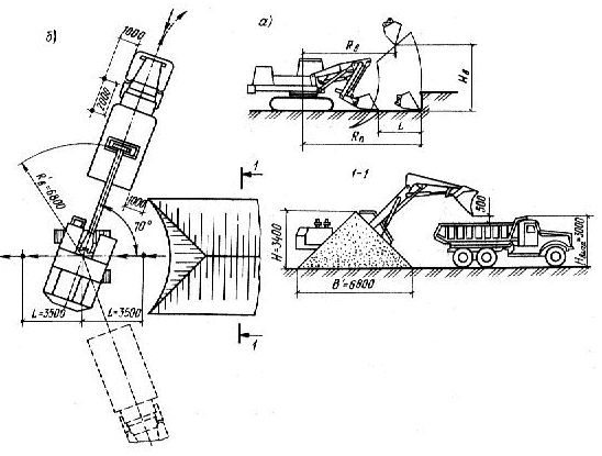 Рис.13. Схема работы экскаватора ЭО-4121А с погрузочным оборудованием при снятии слоя грунта (а), при по грузке грунта с погрузочным ковшом (б)