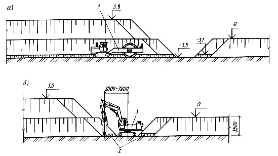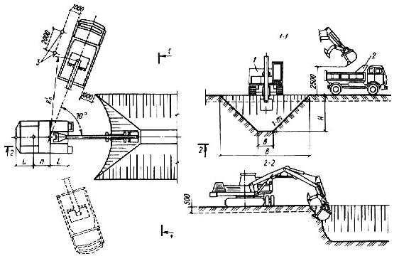 1 - экскаватор; 2 - автомобиль-самосвал; 3 - вешки