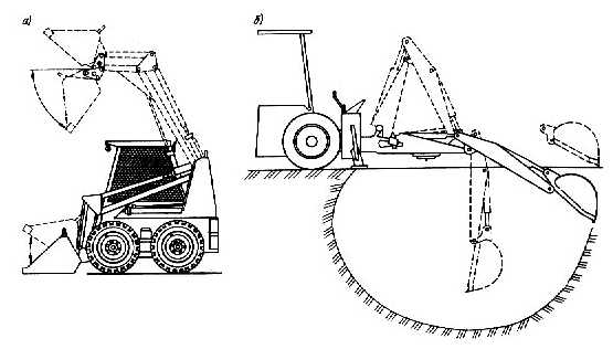 Широкое распространение в строительстве, в том числе в подземном, а также при устройстве подземных частей зданий и сооружений, получают многоцелевые малогабаритные погрузчики. На рис.23 показана схема одной из таких моделей грузоподъемностью до 1 т. Погрузчик может быть оснащен сменным экскаваторным оборудованием для разработки выемок глубиной до 3 м.