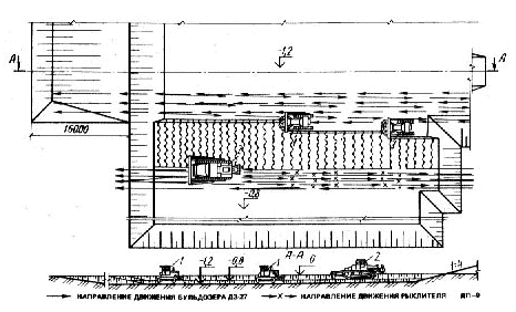Рис.25. Технологическая схема рыхления мерзлого грунта верхнего яруса котлована бульдозером-рыхлителем ДП-9 и перемещение грунта в отвал бульдозерами ДЗ-27