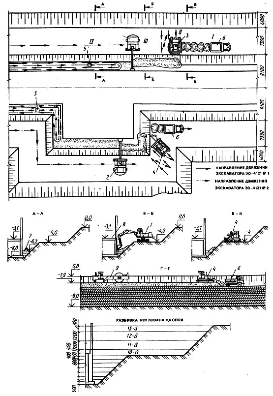 1 - экскаватор ЭО-4121А N1, 2 - экскаватор ЭО-4121 N 2; 3 - бульдозер ДЗ-54 N 1; 4 - бульдозер ДЗ 54 N 2; 5 - виброплита; 6 - автомобиль-самосвал МАЗ-503А; 7 - трамбовка 8 - подземная часть; 9 - виброкаток