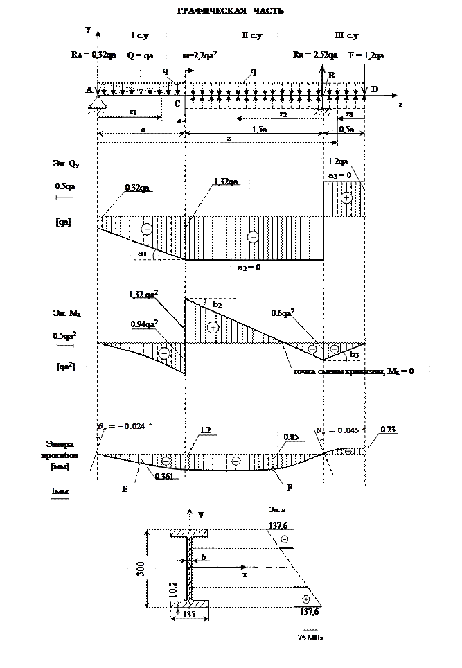 3) Пользуясь универсальными уравнениями метода начальных параметров, определить углы поворота балки под опорами и прогибы балки в двух – трех характерных сечениях. Построить эпюру изогнутой оси балки.