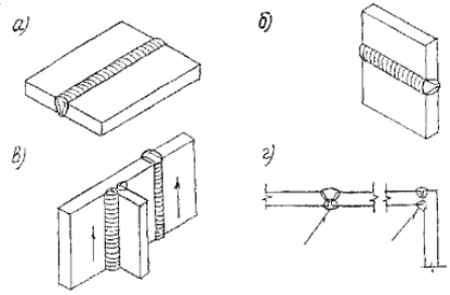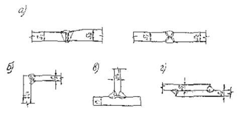 а) стыковые, односторонние и двусторонние; б) угловое; в) тавровое; г) нахлесточное