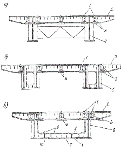 а) балочное; б) коробчатое из цельноперевозимых коробок полной заводской готовности; в) коробчатое, собираемое на монтаже из L-образных балок