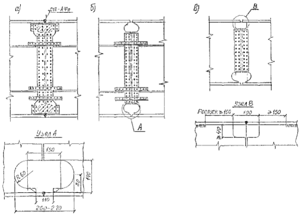 В зоне стыкового шва верхнего пояса в стенках стыкуемых блоков необходимо предусматривать скругленные вырезы высотой и шириной не менее 50 мм для пропуска формирующих подкладок (рис. 5, узел В), или симметричные вырезы по рис. 5б.