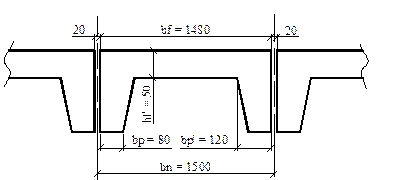 -между продольными ребрами: l1 = bf – 2•bp ’ = 1480 – 2•120 = 1240мм