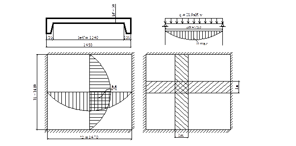 Определяем отношение l1 /l2 = 1240/1230 ≈ 1 < 3, следовательно, полка плиты рассчитывается как плита, опертая по контуру, поэтому ее моменты равны в обоих направлениях. И момент в данном случае равен: