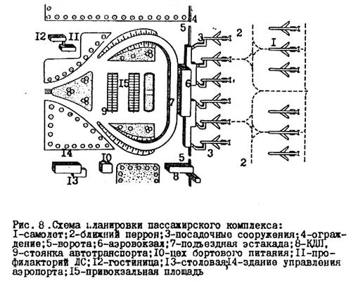 Аэровокзал предназначен для обслуживания вылетающих, прилетающих транзитных авиапассажиров, а также встречающих и провожающих граждан. Аэровокзал располагают в центральной зоне относительно ИВПП с учетом того, чтобы путь следования пассажиров пешком от аэровокзала к самолету и наоборот не превышал 150 м, а по крытому переходу - 250 м. При дальности выше указанной доставку пассажиров производят спецавтотранспортом.