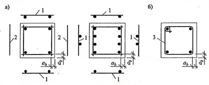 а) сварными каркасами; б) вязанными каркасами; 1- каркасы; 2 – соединительные стержни; 3 – хомуты; аb – защитный слой бетона продольной арматуры