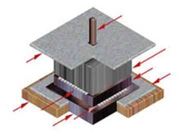 Свинцово-резиновая опора (Lead Rubber Bearing) — это сейсмическая изоляция, предназначенная для улучшения работы зданий и сооружений под сейсмической нагрузкой за счёт интенсивного демпфирования сейсмической энергии, проникающей через фундаменты в эти здания и сооружения. На фото справа показано испытание свинцово-резиновой опоры сделанной из резинового цилиндра со свинцовым сердечником.