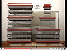 Сравнительные испытания на вибростоле: слева — обычная модель здания, справа — модель, демпфированная вертикальной конфигурацией здания.
