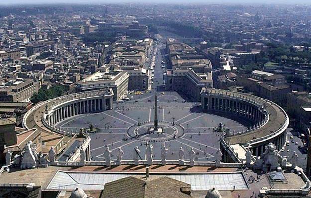 Обнеся колоннадой круглую площадь глубиной в двести восемьдесят метров, архитектор загородил прямой путь к собору, поставив в центре обелиск, а на поперечной оси - два фонтана. С момента выхода зрителя на овальную площадь, колоннады, по выражению Бернини, «подобно распростертым объятиям», захватывают зрителя и направляют его движение к доминанте композиции - главному фасаду, откуда через вестибюль и продольные нефы движение продолжается к алтарю. Просвечивающий в глубине площади и замкнутого трапециевидного пространства, по-разному освещаемый лучами солнца, фасад храма вдруг вырастает во всем величии, зрительно подчеркнутом расходящимися в перспективе галереями.
