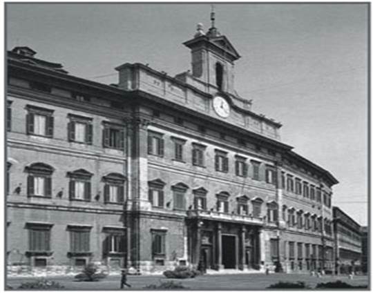 Выразительность палаццо Монтечиторио (Рис. 5) основана на многократно изломанной линии его главного фасада, следующей очертаниям площади, на которую он выходит, но в еще большей мере на сильном выделении его центральной части протяженностью в семь оконных осей. Слегка выступая вперед, наподобие ризалита, она снабжена трехпролетным входным порталом в ордерном обрамлении и увенчана высоким аттиком, отделяющим ее от боковых крыльев. В строгой горизонтали трехэтажного палаццо Одескальки какая-либо акцентировка центра отсутствует вовсе, но зато здесь использован другой выразительный прием: вместо обычного поэтажного членения впервые в архитектуре частных дворцов использован в качестве ведущего композиционного принципа большой ордер. Ровная череда пилястр с коринфскими капителями, охватывающих собой два верхних этажа, вносит в фасад элемент подчеркнутого единства. Этот прием получил впоследствии широкое распространение в европейской дворцовой архитектуре, став олицетворением парадной торжественности.