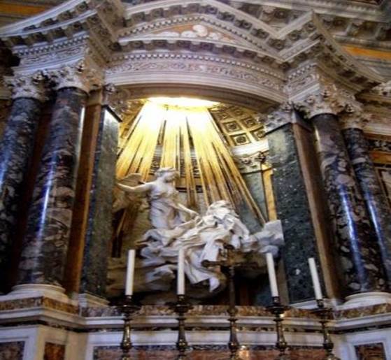 Вклад Бернини в искусство скульптуры не менее значителен. Доводя выразительность до предела, он сочетает разные материалы, и из этого живописного великолепия возникает, например, напоминающая видение композиция «Экстаз св. Терезы», где парящие на облаке фигуры святой и ангела сияют нестерпимой белизной среди колонн цветного мрамора, на фоне бронзового фронтона, серого туфа и позолоченных лучей, испускающих мистический свет, отражая лучи солнца из невидимого зрителю окна.