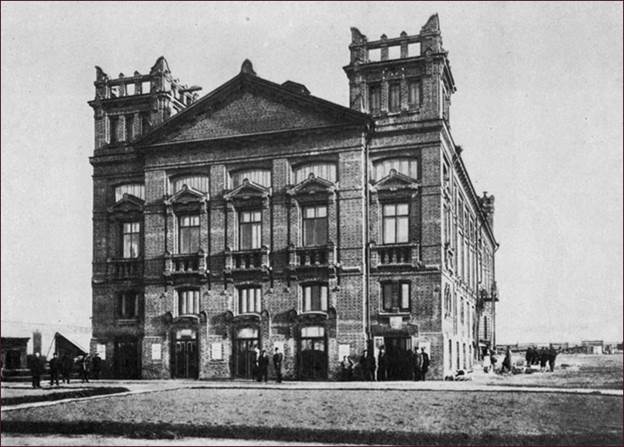 Из-за ограниченных материальных возможностей проект Народного дома был выполнен с предельной экономией площадей. Вместе с тем это здание можно было использовать в качестве театра, зала для собраний на 1200 человек и чайной-столовой. Трехэтажное сооружение, выполненное в кирпиче, выглядело монументальным и достаточно парадным (рис.4). В стилистическом отношении оно еще эклектично. Симметричная композиция здания с четырехпилястровым накладным портиком, фронтоном и трехугольными сандриками над окнами второго этажа характерна для классицизма. Угловые башни, в которых располагались водопроводные баки, с узкими окнами, лучковые перемычки, криволинейные сандрики и внутренняя отделка типичны для модерна. Следует заметить, что симметричный объем Народного дома здесь, на возвышенной части огромной площади, был уместен, так как создавал визуальную ось этой площади. Народный дом вместе с позже построенными кирпичными зданиями расположенного слева винного склада и справа - школы стал основой градостроительного ансамбля площади.