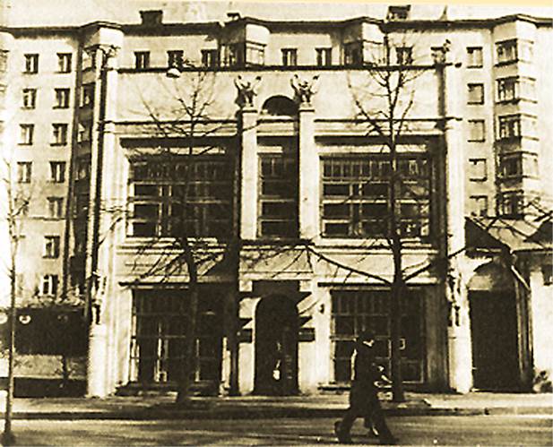 Фасад клиники на ул. Свердлова выглядит скромнее (рис.8). Он соразмерен окружающей застройке. Здесь также использованы полуколонны - "свечи", у основания которых установлены стилизованные скульптурные изображения двух грифонов со сложенными крыльями, а в центре венчающего фасад парапета - еще двух, меньших размеров, с распростертыми крыльями.