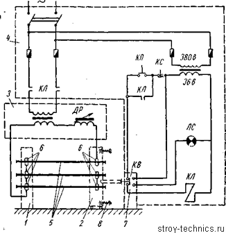 Стержни арматуры, подвергаемые предварительному натяжению, укрепляются в контактных зажимах подвижной и неподвижной стоек. Электрический ток поступает в цепь сварочного трансформатора при включении контактора КЛ кнопкой КП. При этом стержни арматуры, нагреваясь, удлиняются и подвижная стойка передвигается. По достижении расчетной температуры, соответствующей требуемому удлинению стержня, рычаг воздействует на конечный выключатель KB, который разрывает электрическую цепь катушки контактора КЛ, и трансформатор отключается -от сети. Одновременно загорается сигнальная лампа ЛС, указывающая на готовность стержней. Затем стержни снимаются со стоек, укладываются в форму, подвижная стойка под действием пружины возвращается в исходное положение, и цикл повторяется.