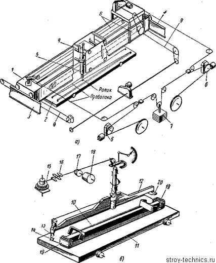 а — арматурно-намоточная; б — ригельная; 1 — мост; 2 — форма-вагонетка; 3 — балки; 4 — каретка; 5 — шток; б — механизм подачи; 7 — механизм натяжения; 8 и 9 — цепные передачи; 10 — контур; 11 — передвижная форма; 12 — балка; 13 — шток; 14 — выдающий ролик; 15 — моток; 16 — профилирующие вальцы; 17 — тянущий барабан; 18 — электромагнитная муфта; 19 — щеки; 20 — толкатель для сбрасывания щек