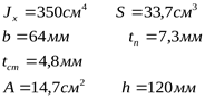 По сортаменту принимаем два неравнополочных уголка 56Ч36Ч5: B=56 мм; b=36 мм; d=5 мм; А=4,41 см2; Jx=13,80 см4; Jy=4,48 см4; iy=1,01 см;
