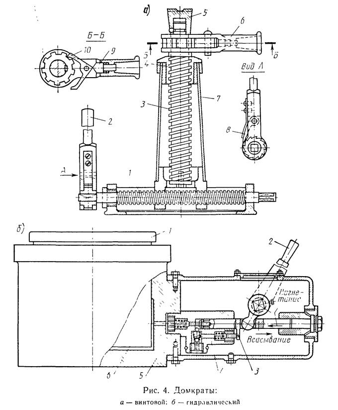 Грузоподъемные машины и механизмы предназначены для перемещения грузов и людей по вертикали и передачи их из одной точки площади, обслуживаемой машиной, в другую. Конструкции таких машин чрезвычайно разнообразны. Их можно классифицировать по конструктивным признакам, по назначению, по характеру выполняемой ими работы. Для подъема груза на небольшую высоту (до 0,8—1 м) служат простейшие грузоподъемные механизмы — домкраты, обычно применяемые при ремонтных и монтажных работах. Привод домкратов может быть ручным и механическим. Различают винтовые, рычажно-реечные, зубчато-реечные и гидравлические домкраты. На рис. 4, а в качестве примера показано устройство ручного винтового домкрата на салазках, облегчающих его точную установку под грузом. Использование винтовой пары с самотормозящей резьбой, обеспечивающей удержание поднятого груза, является причиной низкого коэффициента полезного действия (кпд), равного 0,3— 0,4. Подъемный стальной винт 3 домкрата ввернут в гайку 4, укрепленную в корпусе 7. На верхней части винта установлена рифленая головка 5, которая может поворачиваться относительно винта. Вращение винта 3 производится рукояткой 6 с двусторонней трещоткой W. В зависимости от положения трещотки, фиксируемой кулачком 9, осуществляют вращение винта в одну или в другую сторону. Корпус домкрата в нижней части имеет опорную плиту— гайку, перемещающуюся по направляющим при вращении винта горизонтального перемещения. Вращение этого винта производится рукояткой 2, снабженной трещоткой 8. Грузоподъемность винтовых домкратов колеблется от 2 до 20 т. Сила, необходимая для привода домкрата, определяется из условия равенства момента, создаваемого рабочим на приводной рукоятке, и момента от сил трения в резьбе и между головкой 5 и верхней частью винта. Широко распространены также гидравлические домкраты (рис. 4, б). Они имеют высокий кпд 0,75—0,8), малые габариты и массу, обеспечивают плавный подъем и спуск груза при весьма точной его фиксации в необходимом положении. Грузоподъемность гидравлических домкратов достигает 200 т. Недостатками их являются ограниченная высота подъема груза и малые скорости. Гидравлический домкрат с ручным приводом состоит из скалки 6, снабженной в верхней части упорной головкой 1. Скалка входит в цилиндрическую часть корпуса 5, в нижнюю часть которого плунжерным насосом 4 через систему отверстий и клапанов подается рабочая жидкость (обычно масло). Насос работает от рукоятки 2, при качании которой перемещается плунжер 3 насоса, и жидкость через нагнетательный клапан поступает в пространство между скалкой и дном корпуса. Для опускания скалки необходимо рукоятку 2 отклонить за пределы рабочего положения. При этом открывается выпускной клапан и жидкость под воздействием силы тяжести груза перетекает из-под скалки в запасной резервуар. Изменяя отклонение рукоятки, изменяют степень открытия отверстия выпускного клапана и таким образом регулируют скорость опускания груза. Числовое значение скорости подъема груза определяется количеством рабочей жидкости, подаваемой под скалку 6 в единицу времени. Так как скорость подъема груза при ручном приводе весьма невелика, то при больших высотах подъема и больших грузоподъемностях гидравлические домкраты имеют механизированный привод.