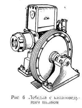 применение находят шпили (рис. 7) — лебедки с фрикционным бара6аном, имеющим горизонтальную или вертикальную ось вращения. Канат, на конце которого приложена рабочая нагрузка, не закреплен на барабане, как в обычных лебедках, а сцепляется с ним силой трения, возникающей между поверхностью барабана и несколькими витками каната, намотанными на него. Это позволяет