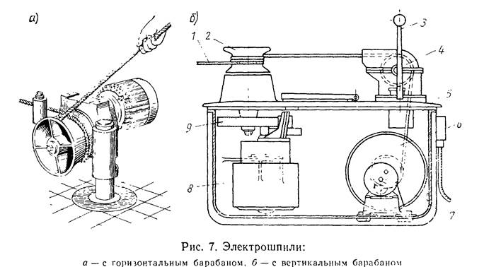 Имеются элекгрошпили со встроенным вспомогательным барабаном для навивки каната (рис. 7,6). В этих конструкциях три-четыре витка тягового каната обвивают фрикционный барабан 2, и через отклоняющий блок 4 канат подается к вспомогательному барабану 6, который приводится в движение вспомогательным двигателем 7 небольшой мощности, снабженным электромагнитным тормозным ycтpoйcтвoм.