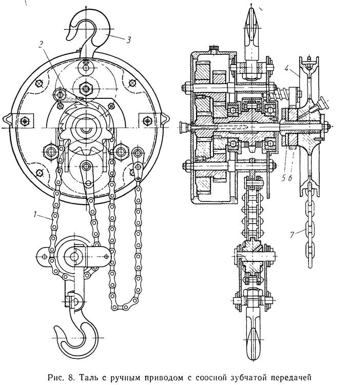 Для внутрицехового и межцехового транспортирования грузов, обслуживания поточных и автоматических линий, станков и т. п. применяются компактные подъемные лебедки — тали, имеющие ручной, электрический или пневматический приводы. Тали устанавливают стационарно или на передвигающихся тележках. На рис. 8 показана таль с ручным приводом. Ее подвешивают к опоре за крюк 3. Привод тали осуществчяют с помощью бесконечной цепи 7, находящейся в зацеплении с приводным колесом 4. В качестве грузового элемента в таких талях используют пластинчатую цепь или сварную калиброванную цепь. Поднятый груз удерживают в неподвижном состоянии дисковым тормозом 5, который замыкается весом транспортируемого груза. В этом случае ступицу цепного колеса 4 выполняют в виде гайки, зажимающей храповое колесо 6 тормоза. Собачку 2 тормоза