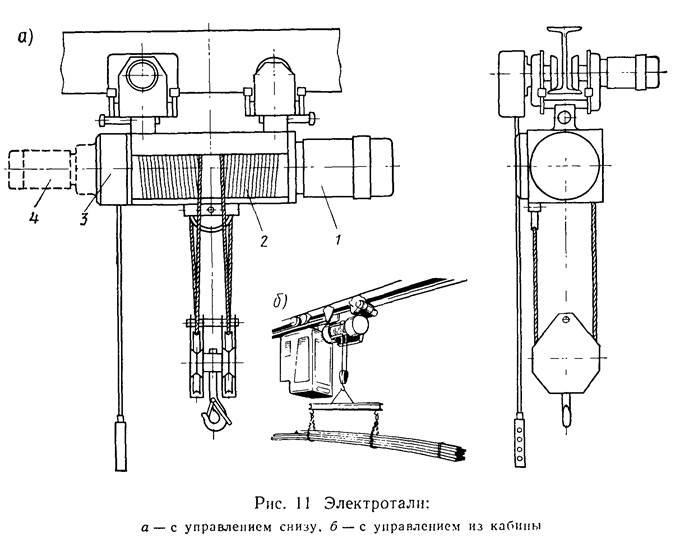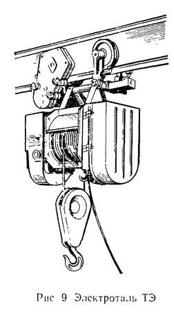 Грузоподъемность электроталей составляет 0,25—15 т, скорость подъема 5—25 м/мин. Скорость горизонтального передвижения талей устанавливают в зависимости от длины пути и назначения тали. На рис. 9 представлен общий вид электротали ТЭ грузоподъемностью до 5 т, обеспечивающей подъем груза на высоту 3—18 м