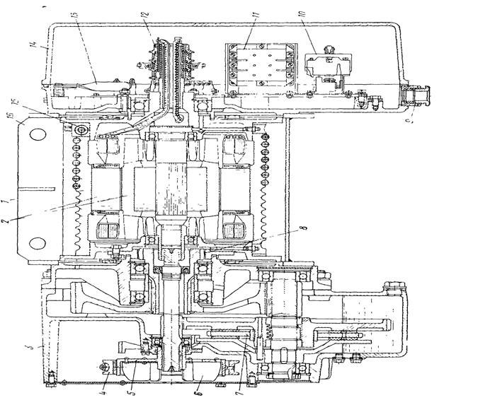 вентилятора, охлаждающего обмотки двигателя. Для улучшения охлаждения корпус редуктора 3 дополнительно снабжен охлаждающими ребрами. Соединение барабана с выходным валом редуктора осуществлено с помощью зубчатой муфты 8, компенсирующей неточности монтажа. Со стороны, противоположной редуктору, расположен шкаф электроаппаратуры 14, в котором располагаются