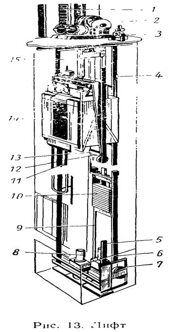 метеорологических вышек. Пассажирский лифт (рис. 13) состоит из кабины 14, движущейся в жестких вертикальных направляющих 12, предохраняющих кабину от раскачивания кабину в сучас обрыва несущего каната 15 с помощью специальных ловителей 13. Срабатывание ловителей происходит при превышении кабиной расчетной скорости опускания, для чего лифт снабжается ограничителем скорости 3, работающим от специального каната, соединенного с кабиной и через блок ограничителя и блок 7, установленный в нижней части шахты. Привод 2 .лифта располагается в машинном отделении в верхней части шахты. Для уменьшения потребной мощности двигателя обычно применяют противовесы 10, масса которых равна массе кабины и половине массы полсшого груза. Противовесы движутся по своим направляющим 9. В нижней части шахты располагаются буферные устройства 8 — для кабины и 5 — для противовеса. Аппаратура управления (магнитная станция) 1 располагается в шкафу около привода. Крайнее верхнее и нижнее положения кабины ограничиваются установкой конечных выключателей 4 и 6. Для подачи электроэнергии к системе управления, расположенной в кабине, используется гибкий кабель 11. Номинальная грузоподъемность пассажирских лифтов устанавливается по принципу свободного заполнения полезной площади пола кабины. При этом масса человека принимается равной 80 кг, а грузоподъемность лифта для обычных жилых зданий составляет 350—500 кг. Номинальная скорость движения кабины регламентируется