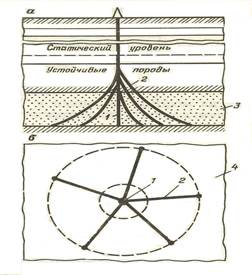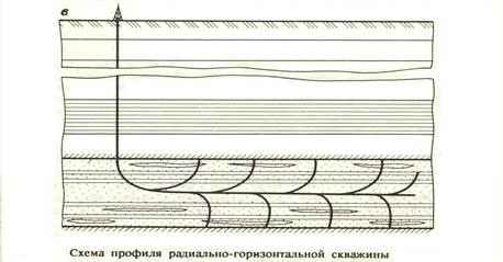 У радиальных скважин основной ствол проводят горизонтально, а дополнительные – в радиальном направлении.