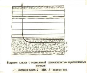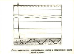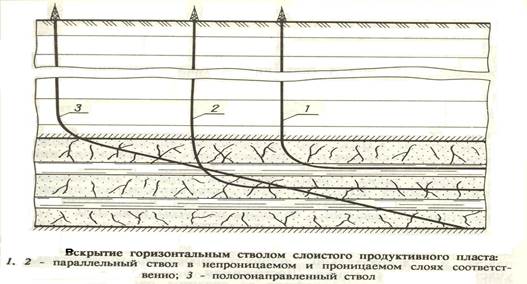 При разбуривании пластов большой толщины (100 м. и более) иногда сооружают по два-три яруса горизонтальных стволов. Такие скважины позволяют успешно эксплуатировать залежи с высоковязкой нефтью. В этом случае теплоноситель закачивают в средний ярус скважин, а отбор нефти ведут через ярус дополнительных стволов.