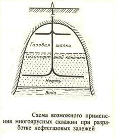 Многоярусные скважины с горизонтальными стволами сооружаются при разбуривании залежей большой толщины, имеющих газовую шапку. В этом случае верхний ярус стволов бурится в пределах газовой шапки, а нижний – в нефтяной части залежи.