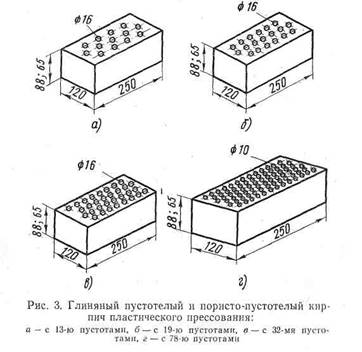 Глиняный пустотелый и пористо-пустотелый кирпич пластического прессования изготовляют из глин с добавками или без них и обожженный (рис. 3).