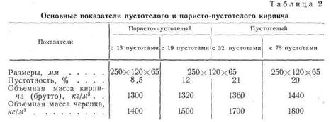Характеристика пустотелого и пористо-пустотелого кирпича приведена в табл. 2.