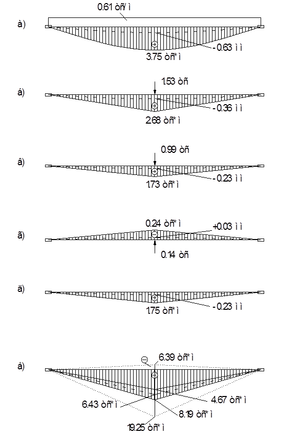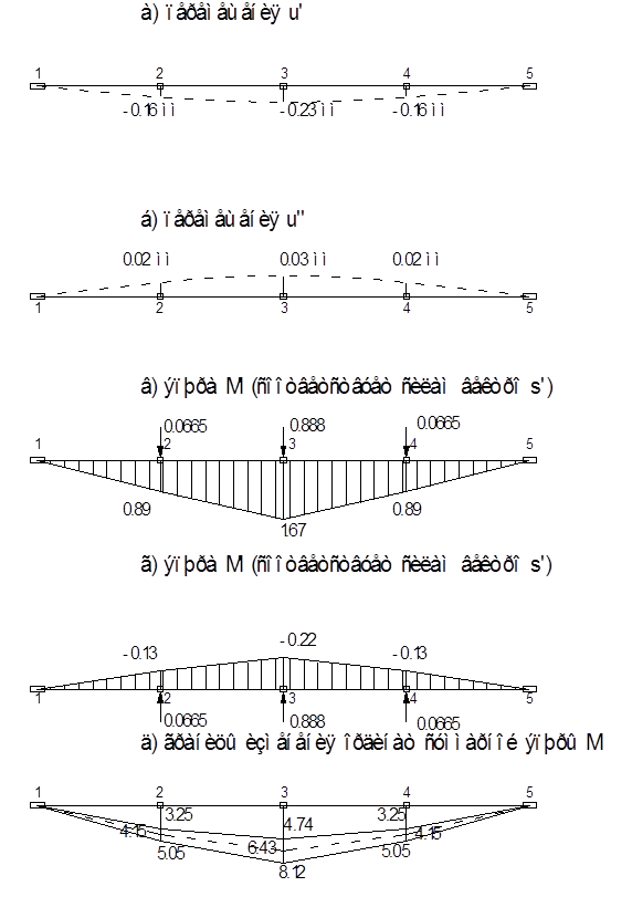 Эпюры изгибающих моментов при рассмотренных загружениях 1,2,3 соответственно изображены на рис. 3,а-3,г. В третьем (динамическом) загружении получаются две эпюры (рис. 3,в,г). Они соответствуют разложению суммарной нагрузки на колебания по синусу и косинусу. На рис. 3,д изображена эпюра расчетных изгибающих моментов при динамическом загружении, полученная по формуле для