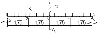Рассмотрим решение этой же задачи с использованием расчетной схемы МКЭ, когда балка по длине пролета разделена на 4 равных конечных элемента типа 2. В этом случае при загружении узла 3 динамической нагрузкой получим расчетную схему в виде системы с тремя степенями свободы, которая может быть представлена в виде, приведенном на рис. 4.