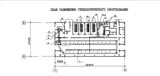 Здание в плане представляет собой прямоугольник с размерами в осях: 1–8 (42 м) и А–Б (21 м). Отметка низа стропильной конструкции составляет 3.4 м.