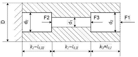 1.1.1 Разбиваем брус на участки (I, II, III), (см. рисунок 3). Границами участков являются переходные по размерам поперечные сечения бруса и сечения, в которых приложена внешняя нагрузка (сосредоточенные силы F1, F2, F3).