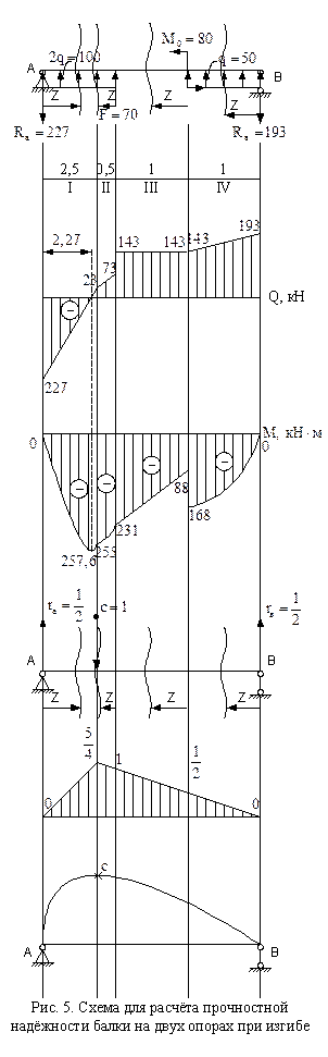 По уравнениям рассчитываем граничные для каждого участка балки значения М, откладываем эти значения с учетом знаков в соответствующих сечениях без масштаба и строим эпюру по длине балки (рис. 5)