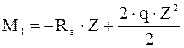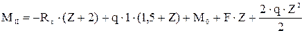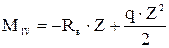 Правило определения величины изгибающего момента в сечении заключается в следующем. Изгибающий момент в сечении балки равен сумме моментов всех внешних сил (в том числе и опорных реакций) относительно сечения для рассматриваемой части балки. При этом для рассматриваемой левой части балки момент считается положительным, если он направлен по ходу часовой стрелки относительно сечения. Для рассматриваемой правой части балки момент считается положительным, если он направлен против хода часовой стрелки относительно сечения, иначе – моменты считаются отрицательными. Согласно данному правилу составляем уравнения для расчета изменения величины М на каждом участке балки.