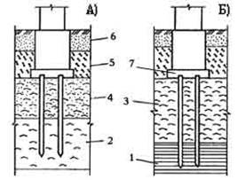 1 - плотный известняк;2 - суглинок илистый пластичный;3 - ил;4 - илистый песок;5 - торф;6 - растительный слой;7 - ростверк.