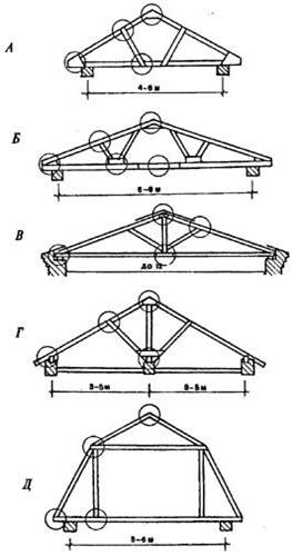 Главные составляющие несущей конструкции крыши - стропильные фермы и обрешетка.Стропильные фермы для различных форм крыши имеют свои особенности ("Строительные фермы", А - висячая ферма однопролетного дома; Б - ферма с подкосами; В - ферма для однопролетного дома шириной более 8 м; Г - наклонная стропильная ферма; Д - ферма для мансардной крыши).