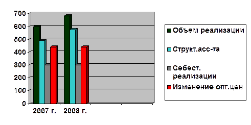Из таблицы 8 видно, что прирост прибыли по сравнению с 2007 г. составил 630 тыс. руб. Он образовался благодаря снижению полной себестоимости реализации товаров, продукции, работ и услуг (300 тыс. руб.), повышению оптовых (отпускных) цен (440 тыс. руб.) и сдвигам в структуре продукции (489 тыс. руб. или 573 тыс. руб.) при одновременном уменьшении прибыли за счет снижения объема реализации (599 тыс. руб. или 683 тыс. руб.). Графически это выглядит следующим образом (Диаграмма 3):