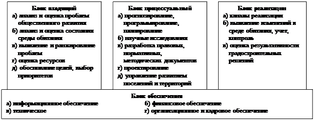 Блок обеспечения включает: информационное, техническое, организационное, кадровое, финансовое обеспечение градостроительной и территориально-планировочной деятельности.