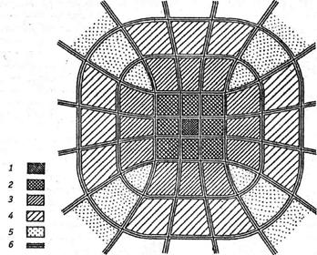 4) жилой район – межмагистральная территория на 25-80 тыс. жителей, в границах которой размещены жилые микрорайоны или кварталы, центр периодического обслуживания, районный парк, коммунальная зона (рис. 13.1).