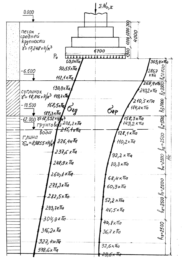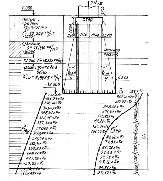 где b - безразмерный коэффициент, равный 0,8; szp = a×Po ; szg,o = NG,I I /(Aусл – Асвай ) = 26205,3 кН/(102,32 м2 - 33×0,4 м×0,4 м) = 270 кПа - определяется с учетом взвешивающего действия воды; Po = P - szg,o = 598 кПа - 270 кПа.= 328 кПа; Pср,II = 598 кПа - среднее давление по подошве фундамента, определенное от действия нормативных нагрузок.